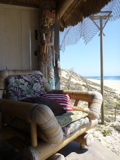 Donna invited me to camp just next to where she was living and I could use shower and restroom at here place. Donna has a fantastically beautiful, mystic, peaceful place. Her Bali-Hut's as she calls them because they were inspired by the trips she took to Bali for many years and what she saw there at the beach. And that is how she designed her houses here in Cabo. Very beautifully simple. Solar powered 12 Volts only, open on two sides, just perfect for the hot weather here. Her yard is full of plants, palm trees, birds, turtles, dogs, little things here and there. Just like one of those pictures you can look at again and again and discover something new each time you look at it. Just fantastic. I camped there for two nights, Donna let me use one of her Bali-Huts to spend the day. This was one of the most peaceful days of my entire trip. I was sitting up there overlooking the ocean, listening to the waves hitting the shore, reading, napping away, planning the next couple of days of my trip, taking a nap again, just some how magic how those simple Bali Huts just blend in with the nature of the beach and the shore and almost become one with it. Donna barbaqued a fantastic dinner, I supplied a bottle of wine that was hidden in the blue truck's wine cellar since California. It was interesting to just chat along with Donna about how she started building the Bali Huts, how she came to Cabo over 20 years ago, when none of the Gringo mansions where there. Her life of travelling in her perfectly set up motorhome and all along the dogs got the bones of the so tasty rips that came off the bbq. Soon it was late, it was just two nights since full moon and as soon as my eyes got used to the the limited light I could find my way along the beach back to where the blue truck was parked, popped the roof and in the moring headed off towards Cabo.
